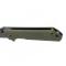 Manche en G10 vert antidérapant avec trou à l'arrière pour le passage d'une dragonne et anneaux anodisés autour de la vis d'axe et de la vis de poignée.