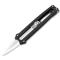 Une lame en acier D2 de forme Drop Point, satinée et lisse. Ouverture avec un bouton sort vers le haut ou vers le bas, une détente à mi-course augmente la sécurité du travail.