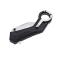 Manche texturé G10 noir avec contour des vis anodisé bleu qui se termine par l'anneau à l'extrémité du manche destiné auparavant à accrocher le couteau au petit doigt.