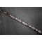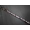 Crosse en bois incrusté d'éléments cylindriques en laiton et os (ou ivoire).Le bois est également décoré de plaques dargent découpé et serti de cabochons de corail rouge.