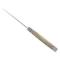 Manche 12 cm en olivier contrecollé sur plaquettes ébène. Deux mitres en inox mat et ressort guilloché.