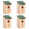 4 pcs Nichoirs Bois 12x12x22 cm Ce joli nichoir en bois, construit en bois de pin durable, est conçu pour une famille chanceuse à plumes ! Il égayera votre jardin et abritera vos amis à plumes. Livré avec un toit vert et un boîtier de couleur du bois, ce sera également un ornement parfait, ainsi qu'un nid d'oiseau. Équipé d'un crochet en métal au sommet, il peut être suspendu dans votre jardin. La livraison comprend 4 nichoirs.