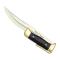 Un couteau outdoor ou de chasse à lame pleine soie lisse en acier inoxydable X50CrMoV15 forme Clip Point résistant à la corrosion avec inscription Muela sur la lame.