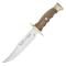 Un couteau de chasse à lame lisse en acier inoxydable X50CrMoV15 résistant à la corrosion avec inscription Muela "Bowie" sur la lame.