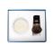 La brosse est réalisée en acétate très résistant. Légère et avec une bonne prise en main. Ce modèle est proposé en taille 12, standard, bien adaptée à un usage quotidien avec son support adapté en plexi-cristal pour un rangement « Tête en bas », indispensable pour un bon séchage, Manche traditionnel en résine et un bol en porcelaine de Limoges avec son savon à barbe.