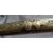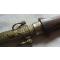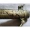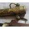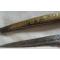 Dague à poignée en bois, à forte lame ancienne en acier à un tranchant et deux gorges (lame de sabre réutilisée ?). Fourreau, en bronze ciselé à décor de volutes, rosaces. Longuer totale 47cm, lame 29cm.