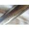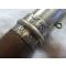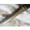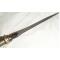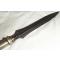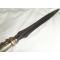 Pointe en acier bronzée de 24cm suivie d'une partie cylindrique en acier de 58cm avec trois tenons pour fixer une flamme de lance. Partie en bois restante de 30cm.