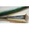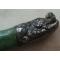 A lame droite en acier gravée sur le plat et sur le dos d'un motif losangé, à poignée à plaquettes en os, et soie en métal gravé d'un motif ondulé. Fourreau recouvert de cuir vert.