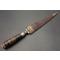 Ancien stylet corse à lame solidement forgée, talon plat double tranchant longue de 16cm, traces d'oxydation. Poignée composée de multiples rondelles de corne maintenue par deux mitres laiton. Fourreau d'époque bois recouvert de cuir à deux garnitures de laiton patinée. Longueur totale 26cm
