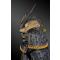 Mempo de type me no shita men en fer, à moustache en crin, lèvre supérieure laquée rouge et dents dorées ; mengu composé de quatre lamelles en laque.