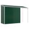 Abri de jardin avec toit prolongé vert 277x110,5x181 cm acierCet abri de jardin robuste, qui se distingue par son toit prolongé, est parfait pour ranger une grande variété d'articles tels que des outils, des meubles de jardin, du matériel de jardinage et bien plus encore. Matériau robuste : l'abri de jardin est fabriqué en acier galvanisé, ce qui l'empêche de rouiller et lui permet de résister à une utilisation de longue durée. L'acier est un matériau exceptionnellement dur et résistant. Il offre robustesse et stabilité. La galvanisation offre une meilleure protection contre la corrosion et est utile pour les produits qui seront utilisés à l'extérieur et dans des environnements difficiles.Grand espace de rangement : cet abri en métal offre beaucoup d'espace pour ranger votre bois de chauffage, vos outils de jardinage, vos meubles, votre équipement et bien plus encore. Il dispose également d'un toit prolongé pour stocker le bois de chauffage. Le toit peut être fixé d'un côté ou de l'autre de l'abri.Poignées pratiques : l'abri de rangement de jardin est équipé de poignées pour faciliter l'accès à l'abri.Bonne ventilation : l'abri d'extérieur est équipé de 2 bouches d'aération qui permettent de réduire l'accumulation d'humidité et d'odeurs dans la maison.Design incliné : le toit incliné assure une évacuation sans problème de l'eau.