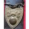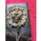 Accessoires de banderole de giberne comprenant une tête de lion et un écu à la grenade, réliés par des chaînettes. Patinés et encore montés sur un moignon de la banderole d'origine. Second empire ou 3e république?
