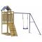 Aire de jeux d'extérieur bois de pin imprégnéVous voulez donner à vos enfants la liberté de jouer à la maison ? Cet ensemble de jeu d'extérieur en bois transforme votre jardin en un terrain de jeu propice aux aventures imaginatives ! Matériau durable : ce cadre d'aire de jeux de jardin est fabriqué en bois de pin imprégné sous vide. Le bois de pin massif est connu pour sa résistance et sa durabilité. Ses grains droits et ses noeuds distinctifs contribuent à son charme rustique. Il a été imprégné avec une solution de conservation et a subi un traitement en autoclave, ce qui renforce sa résistance à la pourriture et aux intempéries.Cadre en bois stable : le cadre en bois de la maisonnette de jardin garantit sa robustesse et sa stabilité. De plus, les pieds en forme de A de la balançoire pour enfants permettent de garder l'équilibre.Centres multi-activités : le cadre d'escalade est doté d'une plate-forme de 90 cm de hauteur et se distingue par son mur d'escalade, une balançoire simple ainsi qu'un bac à sable. Vos enfants peuvent également inviter leurs amis à s'amuser.Conception réfléchie : les garde-corps en bois qui entourent l'abri sont conçus pour assurer la sécurité des enfants pendant qu'ils s'amusent. De plus, le toit en forme de nuage offre de l'ombre à vos enfants pendant les chaudes journées d'été.Plaisir sans fin : cette aire de jeux d'extérieur en bois est le moyen idéal pour vos enfants et leurs amis de se divertir, d'avoir plus de temps interactif et de créer des souvenirs pour vous et vos enfants ! Attention :Uniquement pour un usage domestiqueUtilisation extérieureNe convient pas aux enfants de moins de 3 ansÂge recommandé : 3-8 ansPoids maximal par utilisateur : 45 kg Bon à savoir :Le produit doit être ancré afin de réduire les risques de basculement. Les ancrages ne sont pas inclus. Avertissement. Ne convient pas aux enfants de moins de 3 ans. Usage domestique uniquement. GPSR