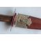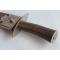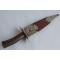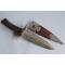 Belle et ancienne dague de chasse lame en acier de Toledo, gravée d'une scène de chasse et gibiers manche en corne de cerf avec son fourreau d'origine en cuir et acier gravé fabriquée à Tolède, en Espagne longueur lame : 19,5 cm / largeur lame : 5,6 cm bon état