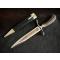 Ancien poignard allemand de collection. Année 1960-1980. Solingen. Lame polie 18 cm. Le manche est en corne de sambar. Gaine en cuir traditionnelle.