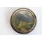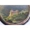 Ancienne boite ronde en bois laqué, couvercle orné d'une peinture sur cuivre sous verre, cerclage en pomponne Château, probablement dans les Alpes suisses diamètre de la peinture : 8,5 cm bon état