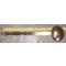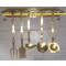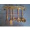Anciens ustensiles de cuisine et leur présentoir, le tout en laiton, les embouts et les tourillons de la barre sont en cuivre. Support large et solide, 59cm x 9cm, épaisseur 3mm. Une louche, une écumoire, une louche à confiture, une spatule et une fourchette 3 dents.