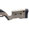 Châssis MDT XRS FDE : ergonomie hybride entre crosse tactique et stock classique, avec poignée pistolet verticale, fût M-LOK, busc réglable, et plaque de couche ajustable.