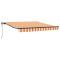 Auvent Rétractable Jaune et Orange 350 x 250 cmCe store rétractable moderne est une super option pour l'extérieur, alliant praticité et look stylé, parfait pour les jardins et terrasses. Avec son design moderne et épuré, il s'intègre bien dans les espaces contemporains. Il offre une protection idéale contre le soleil et les pluies légères, rendant vos moments à l'extérieur agréables et détendus. Matériaux de qualité : Fait en tissu solide et aluminium, ce store est fiable. Le tissu résiste aux UV et à l'eau, idéal pour durer dans le temps. Le cadre en aluminium assure la stabilité même par temps capricieux. Inclus dans le paquet : Le pack comprend le tissu du store, un cadre en alu robuste pour l'installer, et une télécommande pour plus de confort. Chaque élément est essentiel pour une utilisation facile et efficace. Facilité de rétractabilité : Grâce à sa fonction rétractable, vous pouvez facilement ajuster le store pour profiter de l'ombre selon vos besoins. Que vous utilisiez le mécanisme manuel ou la télécommande, c'est super simple. Utilisation estivale : Idéal pour les journées ensoleillées, ce store est parfait pour profiter de vos espaces extérieurs tout en restant à l'abri des rayons du soleil. Conseils d'entretien : L'assemblage se fait à deux avec un tournevis. Pensez à vérifier le store de temps en temps pour enlever les débris, et pour le nettoyer, un peu de savon doux avec de l'eau suffit. Cela aidera à prolonger sa durée de vie et garder son look ! Danger ! Ressort fort lors de l'ouverture. Ne retirez pas cette corde si vous n'avez pas terminé toutes les étapes d'assemblage avec tous les boulons fixés et l'article fixé au mur ! Avertissement! Faire attention en desserrant les bras, car ils sont sous tension ! Un relâchement soudain du bras d'un auvent à bras articulés peut provoquer des blessures. Avertissement : Les instructions d'utilisation doivent être lues avant d'utiliser le produit. Avertissement: Le fonctionnement dans des conditions de gel peut endommager le produit. Utilisation externe dans les bâtiments et autres travaux de construction. Ne laissez pas les enfants jouer avec le dispositif de commande du store. Gardez la télécommande hors de portée des enfants.