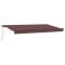 Auvent Rétractable Marron 400 x 200 cm tissuCe store rétractable moderne est parfait pour les jardins et terrasses, alliant chic et praticité. Sa silhouette épurée avec des motifs rayés crée une ambiance vibrante tout en bloquant le soleil brûlant de l'été. Style européen Parfait pour les espaces extérieurs modernes, ce store affiche un design stylé avec des lignes nettes, se fondant dans tous les aménagements de terrasse ou de patio. Sa fonctionnalité rétractable en fait un choix versatile pour profiter du soleil avec classe. Matériaux solides En tissu durable, il résiste aux rayons UV et à l'eau. Le cadre en aluminium ajoute à la robustesse tout en restant léger pour une installation facile. Flexibilité Le store peut s'étendre pour un maximum d'ombre ou se rétracter pour un rangement simple. Idéal pour ajuster la lumière selon vos envies et rendre votre espace encore plus confortable. Facile à entretenir Un simple coup de chiffon humide suffit pour le garder propre. Faisant face à tous les éléments, il est conçu pour durer sans trop d'effort d'entretien. Adaptabilité Que ce soit dans un jardin, sur une terrasse ou près d'une piscine, ce store sait s'adapter aux différents espaces extérieurs. Il est parfait pour des soirées entre amis ou pour se relaxer tranquillement. Danger ! Ressort fort lors de l'ouverture. Ne retirez pas cette corde si vous n'avez pas terminé toutes les étapes d'assemblage avec tous les boulons fixés et l'article fixé au mur ! Avertissement! Faire attention en desserrant les bras, car ils sont sous tension ! Un relâchement soudain du bras d'un auvent à bras articulés peut provoquer des blessures. Avertissement : Les instructions d'utilisation doivent être lues avant d'utiliser le produit. Avertissement: Le fonctionnement dans des conditions de gel peut endommager le produit. Utilisation externe dans les bâtiments et autres travaux de construction.