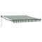 Auvent Rétractable Vert et blanc 350 x 250 cmLes awnings rétractables pour l'ombre extérieure allient design moderne et praticité. Avec son joli motif de rayures vertes et blanches, cette awning apporte vraiment une touche sympa à ton espace extérieur. Elle est assez grande pour fournir de l'ombre durant les journées ensoleillées, parfaite pour balcons, patios ou jardins où tu veux te relaxer. Matériaux de Qualité : Cette awning est faite en polyester résistant qui gère bien le soleil et la petite pluie. Elle reste jolie et fonctionnelle au fil du temps. Ajustements Faciles : Son mécanisme manuel te permet de choisir combien d'ombre tu veux, et tu peux l'ajuster sans outils. Super pratique ! Grande Couverture : Avec ses 350 x 250 cm, elle couvre bien une grande surface, parfaite pour un coin cosy ou des gros rassemblements. Elle transforme ton espace extérieur en un endroit sympa. Look Stylé : Le design rayé vert et blanc offre une belle touche qui s'harmonise bien avec les styles modernes extérieurs. Ses lignes épurées rendent les balcons et jardins encore plus jolis. Entretien Facile : Pour garder l'awning au top, un simple nettoyage à l'eau froide suffit, sans produits chimiques qui abîment le tissu. Resserre les vis de temps en temps pour être sûr que tout reste en place pendant l'utilisation. Danger ! Ressort fort lors de l'ouverture. Ne retirez pas cette corde si vous n'avez pas terminé toutes les étapes d'assemblage avec tous les boulons fixés et l'article fixé au mur ! Avertissement! Faire attention en desserrant les bras, car ils sont sous tension ! Un relâchement soudain du bras d'un auvent à bras articulés peut provoquer des blessures. Avertissement : Les instructions d'utilisation doivent être lues avant d'utiliser le produit. Avertissement: Le fonctionnement dans des conditions de gel peut endommager le produit. Utilisation externe dans les bâtiments et autres travaux de construction.