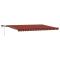 Auvent Rétractable orange et marron 500 ×300 cm tissuCet auvent rétractable, c'est le combo idéal entre style et praticité, offrant une super solution d'ombrage pour tes espaces extérieurs. Avec ses lignes épurées et son look minimaliste, il est parfait pour les balcons ou les terrasses, créant un lieu idéal pour se détendre. Il est fait pour résister aux intempéries, et son mécanisme manuel robuste te permet de le dérouler ou de le ranger facilement en fonction de tes besoins en ombre. Parfait pour des moments chill ou une soirée tranquille dehors, il crée vraiment une super ambiance avec ses lumières intégrées. Matériaux Résistants aux Intempéries Fait en tissu résistant aux UV et à l'eau, cet auvent est assez solide pour résister à tous les types de temps. Il ne se décolorera pas au soleil, donc il garde son allure longtemps. Éclairage LED Intégré Avec des bandes LED flexibles, l'auvent éclaire ton extérieur, créant une atmosphère sympa après la nuit tombée. Parfait pour une soirée tranquille ou pour recevoir des amis. Mécanisme de Fonctionnement Manuel C'est simple à ajuster ; il suffit de le tirer ou de le ranger selon tes besoins. Pas de gadgets compliqués juste un ombrage flexible et facile. Attrait Esthétique Moderne Le design contemporain met l'accent sur la simplicité et la praticité. La finition en poudre apporte une touche de classe tout en le protégeant des intempéries. Entretien et Maintenance Faciles Le garder propre est super easy juste un coup de chiffon humide, pas de produits chimiques agressifs. Traite le tissu avec un spray imperméabilisant avant une forte pluie pour le garder encore plus longtemps. Le mode d'emploi doit être lu avant le montage et l'utilisation du produit. Conservez ce manuel pour pouvoir vous y référer ultérieurement. Ce produit est destiné à être utilisé à l'extérieur et à l'intérieur comme protection solaire ou décoration uniquement. Ne l'utilisez jamais à d'autres fins et ne le modifiez pas. Ne l'utilisez pas dans des endroits soumis à des vibrations, à des impulsions ou à des températures élevées, comme les murs situés à proximité d'un four. Portez toujours un équipement de protection individuelle approprié lorsque vous montez et réglez le store. Il y a un risque de chute lors de travaux en hauteur, utilisez une protection anti-chute appropriée. Soyez prudent lors de l'installation, des risques d'écrasement et de cisaillement peuvent exister. N'enlevez PAS les bandes de sécurité. Ils ne peuvent être enlevés qu'une fois que toutes les étapes de l'assemblage sont terminées, que tous les boulons sont fixés et que l'article est fixé au mur. Des blessures graves peuvent résulter d'un retrait prématuré de l'emballage. Ce produit et ses pièces de fixation ne conviennent que pour une installation sur un mur en ciment ordinaire ou sur une maçonnerie stable et non enduite. Si le mur/la maçonnerie présente des fissures, vous devez consulter un professionnel. Si votre bâtiment possède une enveloppe extérieure (telle qu'une isolation, un double mur en briques ou un parement en briques), l'installation doit être effectuée par un professionnel. Ne l'installez jamais dans des endroits élevés et venteux, car le parasol pourrait tomber et blesser des personnes. N'installez pas le store si des pièces endommagées ou manquantes sont trouvées. Le store extérieur doit être rétracté si la vitesse du vent est supérieure à 28km/h. Avant d'ouvrir le store, assurez-vous que tous les supports sont solidement fixés aux montants du mur et que tous les boulons sont correctement serrés. FERMEZ TOUJOURS le store en cas de vent fort ou de bourrasque, de pluie et lorsqu'il n'est pas utilisé. Le non-respect de cette consigne peut entraîner des blessures corporelles et/ou des dommages matériels. De plus, les bras d'extension sont soumis à une forte tension et peuvent causer des dommages ou des blessures graves. Les enfants doivent être surveillés pour s'assurer qu'ils ne jouent pas avec l'appareil. N'utilisez pas l'appareil si une réparation ou un réglage est nécessaire. N'utilisez pas le store lorsque des travaux d'entretien, tels que le nettoyage des vitres, sont effectués à proximité. L'utilisation dans des conditions de gel peut endommager le store. Ne placez pas d'objets lourds sur l'armature, car ils pourraient tomber et causer des dommages. Des fixations trop serrées ou trop lâches peuvent endommager le produit ou être dangereuses pour les personnes. Attention : La toile ne doit pas être enfoncée pendant le fonctionnement, sinon l'eau s'y accumulera. Veuillez ne pas décoller et laver le tissu. Si vous devez remplacer le tissu, demandez l'aide d'experts. Faites attention lorsque vous actionnez le déverrouillage manuel alors que le store extérieur est rétracté, car il peut tomber rapidement si les ressorts sont faibles ou cassés. Danger ! Ressort fort lors de l'ouverture. Ne retirez pas cette corde si vous n'avez pas terminé toutes les étapes d'assemblage avec tous les boulons fixés et l'article fixé au mur ! Avertissement! Faire attention en desserrant les bras, car ils sont sous tension ! Un relâchement soudain du bras d'un auvent à bras articulés peut provoquer des blessures. Avertissement : Les instructions d'utilisation doivent être lues avant d'utiliser le produit. Avertissement: Le fonctionnement dans des conditions de gel peut endommager le produit. Utilisation externe dans les bâtiments et autres travaux de construction.