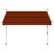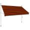 Auvent manuel rétractable 250 cm Orange et marronCet auvent rétractable sera idéal devant la fenêtre, sur la terrasse, le balcon ou dans votre jardin. Cet auvent hydrofuge et anti-salissure et résistant aux UV et aux intempéries est fabriqué en polyester de qualité avec un revêtement PU. Le cadre en acier fort rend l'auvent robuste et durable. L'auvent en polyester facile à nettoyer peut être retiré et lavé. Grâce à la manivelle de la poignée, ce store est rétractable. La hauteur et l'angle du store peuvent également être ajustés. C'est facile à assembler. Cet auvent est le choix idéal pour votre espace de vie extérieur et peut être actionné manuellement. Ne l'installez jamais dans des endroits élevés et venteux, car le parasol pourrait tomber et blesser des personnes. Le store doit être rétracté si la vitesse du vent est supérieure à 27 km/h.