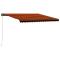 Auvent manuel rétractable 450x300 cm Orange et marronCréez un endroit agréable et frais sur votre terrasse et protégez-vous des rayons UV avec notre auvent rétractable manuel ! Cet auvent est idéal pour l'ombrage des fenêtres, dans les balcons, terrasses, cafés, ainsi que dans les restaurants avec vérandas arrière. Construit avec un cadre en aluminium résistant à la rouille et enduit de poudre, une conception légère et une structure solide, cet auvent extérieur peut résister à une certaine échelle de puissance du vent. Le tissu de l'auvent rétractable manuel est en polyester haute densité avec revêtement PU, résistant à l'eau et aux UV et à la décoloration. L'angle et la hauteur peuvent être ajustés pour répondre à vos besoins spécifiques. Vous pouvez ouvrir et rétracter le store en douceur via la manivelle longue. L'auvent rétractable est facile à monter sur le mur. Le matériel de montage et le manuel nécessaires sont inclus dans la livraison. Les enfants doivent être surveillés pour s'assurer qu'ils ne jouent pas avec l'appareil. Gardez les enfants éloignés de la zone d'assemblage. Avertissement : lisez attentivement les instructions avant d'utiliser l'appareil et conservez-les pour toute référence ultérieure.