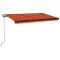 Auvent manuel rétractable 450x350 cm Orange et marronCréez un endroit agréable et frais dans vos espaces extérieurs avec cet auvent rétractable ! Construit avec un cadre en aluminium enduit de poudre résistant à la rouille, cet auvent d'extérieur est léger et robuste. Le tissu de l'auvent de patio est en polyester haute densité avec revêtement en PU, qui est résistant aux UV et à l'eau. De plus, l'angle et la hauteur peuvent être ajustés pour répondre à vos besoins spécifiques. Vous pouvez ouvrir et rétracter l'auvent en douceur avec la manivelle longue. Les enfants doivent être surveillés pour s'assurer qu'ils ne jouent pas avec l'appareil.Tenez les enfants éloignés de la zone de montage. Attention : lisez attentivement les instructions avant l'utilisation et les conserver pour référence ultérieure.