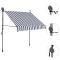 Auvent manuel rétractable avec LED 200 cm Bleu et blancCet auvent rétractable sera idéal devant la fenêtre, sur la terrasse, le balcon ou dans votre jardin. Cet auvent hydrofuge et anti-salissure et résistant aux UV et aux intempéries est fabriqué en polyester de qualité avec un revêtement PU. Le cadre en acier fort rend l'auvent robuste et durable. L'auvent en polyester facile à nettoyer peut être retiré et lavé. Grâce à la manivelle de la poignée, ce store est rétractable. La hauteur et l'angle du store peuvent également être ajustés. De plus, les lampes LED alimentées par l'énergie solaire permettent d'éclairer la nuit. L'auvent est facile à assembler. Cet auvent est le choix idéal pour votre espace de vie extérieur et peut être actionné manuellement. Ne l'installez jamais dans des endroits élevés et venteux, car le parasol pourrait tomber et blesser des personnes. Le store doit être rétracté si la vitesse du vent est supérieure à 27 km/h.