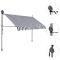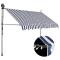 Auvent manuel rétractable avec LED 300 cm Bleu et blancCet auvent rétractable sera idéal devant la fenêtre, sur la terrasse, le balcon ou dans votre jardin. Cet auvent hydrofuge et anti-salissure et résistant aux UV et aux intempéries est fabriqué en polyester de qualité avec un revêtement PU. Le cadre en acier fort rend l'auvent robuste et durable. L'auvent en polyester facile à nettoyer peut être retiré et lavé. Grâce à la manivelle de la poignée, ce store est rétractable. La hauteur et l'angle du store peuvent également être ajustés. De plus, les lampes LED alimentées par l'énergie solaire permettent d'éclairer la nuit. L'auvent est facile à assembler. Cet auvent est le choix idéal pour votre espace de vie extérieur et peut être actionné manuellement. Ne l'installez jamais dans des endroits élevés et venteux, car le parasol pourrait tomber et blesser des personnes. Le store doit être rétracté si la vitesse du vent est supérieure à 27 km/h.