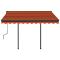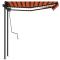 Auvent manuel rétractable avec LED 3x2,5 m Orange et marronCréez un endroit agréable et frais sur votre terrasse et protégez-vous des rayons UV avec cet auvent rétractable manuel ! Cet auvent d'extérieur est construit avec un cadre en aluminium enduit de poudre résistant à la rouille, ce qui le rend léger mais robuste. Le solide poteau en fer le rend stable. Le tissu de l'auvent de patio est en polyester haute densité avec revêtement en PU, qui est résistant aux UV et à l'eau. l'angle et la hauteur peuvent être ajustés pour répondre à vos besoins spécifiques. Vous pouvez ouvrir et rétracter l'auvent en douceur avec la manivelle longue. De plus, les lampes à LED alimentées par l'énergie solaire assurent un éclairage nocturne économe en énergie. Le mode d'emploi doit être lu avant le montage et l'utilisation du produit. Conservez ce manuel pour pouvoir vous y référer ultérieurement. Ce produit est destiné à être utilisé à l'extérieur et à l'intérieur comme protection solaire ou décoration uniquement. Ne l'utilisez jamais à d'autres fins et ne le modifiez pas. Ne l'utilisez pas dans des endroits soumis à des vibrations, à des impulsions ou à des températures élevées, comme les murs situés à proximité d'un four. Portez toujours un équipement de protection individuelle approprié lorsque vous montez et réglez le store. Il y a un risque de chute lors de travaux en hauteur, utilisez une protection anti-chute appropriée. Soyez prudent lors de l'installation, des risques d'écrasement et de cisaillement peuvent exister. N'enlevez PAS les bandes de sécurité. Ils ne peuvent être enlevés qu'une fois que toutes les étapes de l'assemblage sont terminées, que tous les boulons sont fixés et que l'article est fixé au mur. Des blessures graves peuvent résulter d'un retrait prématuré de l'emballage. Ce produit et ses pièces de fixation ne conviennent que pour une installation sur un mur en ciment ordinaire ou sur une maçonnerie stable et non enduite. Si le mur/la maçonnerie présente des fissures, vous devez consulter un professionnel. Si votre bâtiment possède une enveloppe extérieure (telle qu'une isolation, un double mur en briques ou un parement en briques), l'installation doit être effectuée par un professionnel. Ne l'installez jamais dans des endroits élevés et venteux, car le parasol pourrait tomber et blesser des personnes. N'installez pas le store si des pièces endommagées ou manquantes sont trouvées. Le store extérieur doit être rétracté si la vitesse du vent est supérieure à 28km/h. Avant d'ouvrir le store, assurez-vous que tous les supports sont solidement fixés aux montants du mur et que tous les boulons sont correctement serrés. FERMEZ TOUJOURS le store en cas de vent fort ou de bourrasque, de pluie et lorsqu'il n'est pas utilisé. Le non-respect de cette consigne peut entraîner des blessures corporelles et/ou des dommages matériels. De plus, les bras d'extension sont soumis à une forte tension et peuvent causer des dommages ou des blessures graves. Les enfants doivent être surveillés pour s'assurer qu'ils ne jouent pas avec l'appareil. N'utilisez pas l'appareil si une réparation ou un réglage est nécessaire. N'utilisez pas le store lorsque des travaux d'entretien, tels que le nettoyage des vitres, sont effectués à proximité. L'utilisation dans des conditions de gel peut endommager le store. Ne placez pas d'objets lourds sur l'armature, car ils pourraient tomber et causer des dommages. Des fixations trop serrées ou trop lâches peuvent endommager le produit ou être dangereuses pour les personnes. Attention : La toile ne doit pas être enfoncée pendant le fonctionnement, sinon l'eau s'y accumulera. Veuillez ne pas décoller et laver le tissu. Si vous devez remplacer le tissu, demandez l'aide d'experts. Faites attention lorsque vous actionnez le déverrouillage manuel alors que le store extérieur est rétracté, car il peut tomber rapidement si les ressorts sont faibles ou cassés. Danger ! Ressort fort lors de l'ouverture. Ne retirez pas cette corde si vous n'avez pas terminé toutes les étapes d'assemblage avec tous les boulons fixés et l'article fixé au mur ! Avertissement! Faire attention en desserrant les bras, car ils sont sous tension ! Un relâchement soudain du bras d'un auvent à bras articulés peut provoquer des blessures. Avertissement : Les instructions d'utilisation doivent être lues avant d'utiliser le produit. Avertissement: Le fonctionnement dans des conditions de gel peut endommager le produit. Utilisation externe dans les bâtiments et autres travaux de construction. GPSR