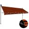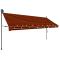 Auvent manuel rétractable avec LED 400 cm Orange et marronCet auvent rétractable sera idéal devant la fenêtre, sur la terrasse, le balcon ou dans votre jardin. Cet auvent hydrofuge et anti-salissure et résistant aux UV et aux intempéries est fabriqué en polyester de qualité avec un revêtement PU. Le cadre en acier fort rend l'auvent robuste et durable. L'auvent en polyester facile à nettoyer peut être retiré et lavé. Grâce à la manivelle de la poignée, ce store est rétractable. La hauteur et l'angle du store peuvent également être ajustés. De plus, les lampes LED alimentées par l'énergie solaire permettent d'éclairer la nuit. L'auvent est facile à assembler. Cet auvent est le choix idéal pour votre espace de vie extérieur et peut être actionné manuellement. Ne l'installez jamais dans des endroits élevés et venteux, car le parasol pourrait tomber et blesser des personnes. Le store doit être rétracté si la vitesse du vent est supérieure à 27 km/h.