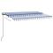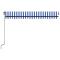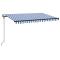 Auvent manuel rétractable avec LED 400x300 cm Bleu et blancCréez un endroit agréable et frais dans vos espaces extérieurs avec cet auvent rétractable ! Cet auvent d'extérieur est construit avec un cadre en aluminium enduit de poudre résistant à la rouille, ce qui le rend léger mais robuste. Le tissu de l'auvent de patio est en polyester haute densité avec revêtement en PU, qui est résistant aux UV et à l'eau. De plus, l'angle et la hauteur peuvent être ajustés pour répondre à vos besoins spécifiques. Vous pouvez ouvrir et rétracter l'auvent en douceur avec la manivelle longue. De plus, les lampes à LED alimentées par l'énergie solaire assurent un éclairage nocturne économe en énergie. Les enfants doivent être surveillés pour s'assurer qu'ils ne jouent pas avec l'appareil.Tenez les enfants éloignés de la zone de montage. Attention : lisez attentivement les instructions avant l'utilisation et les conserver pour référence ultérieure.