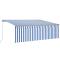 Auvent manuel rétractable avec store et LED 4x3 m Bleu et blancCréez un endroit agréable et frais dans vos espaces extérieurs avec cet auvent rétractable ! Cet auvent d'extérieur est construit avec un cadre en aluminium enduit de poudre résistant à la rouille, ce qui le rend léger mais robuste. Le tissu de l'auvent de patio est en polyester haute densité avec revêtement en PU, qui est résistant aux UV et à l'eau. De plus, l'angle et la hauteur peuvent être ajustés pour répondre à vos besoins spécifiques. Vous pouvez ouvrir et rétracter l'auvent en douceur avec la manivelle longue. De plus, les lampes à LED alimentées par l'énergie solaire assurent un éclairage nocturne économe en énergie. Le store vous protège des rayons UV et offre une protection de l'intimité. Les enfants doivent être surveillés pour s'assurer qu'ils ne jouent pas avec l'appareil.Tenez les enfants éloignés de la zone de montage. Attention : lisez attentivement les instructions avant l'utilisation et les conserver pour référence ultérieure.