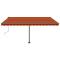 Auvent manuel rétractable sur pied 400x300 cm Orange et marronCréez un endroit agréable et frais dans vos espaces extérieurs avec cet auvent rétractable ! Construit avec un cadre en aluminium enduit de poudre résistant à la rouille, cet auvent d'extérieur est léger mais robuste. Le tissu de l'auvent de terrasse est en polyester haute densité avec revêtement de PU, résistant aux UV et à l'eau. De plus, l'angle et la hauteur peuvent être ajustés pour répondre à vos besoins spécifiques. Vous pouvez ouvrir et rétracter le store autoportant en douceur grâce à la longue manivelle. La base robuste peut pivoter à 360 degrés, ce qui permet un ajustement maximal. Les enfants doivent être surveillés pour s'assurer qu'ils ne jouent pas avec l'appareil.Tenez les enfants éloignés de la zone de montage. Attention : lisez attentivement les instructions avant l'utilisation et les conserver pour référence ultérieure.