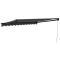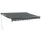 Auvent rétractable anthracite 3,5x2,5 m tissu et aluminiumProfitez d'une boisson fraîche, d'une délicieuse gâterie ou d'une conversation agréable avec des amis sur votre terrasse tout en vous détendant sous cet incroyable auvent rétractable ! Matériau durable : le cadre de l'auvent est en aluminium enduit de poudre, ce qui est robuste et durable. Le tissu avec traitement de surface PU est résistant aux UV. Il protège votre famille ou vos invités des rayons UV et de la lumière éblouissante du soleil. Auvent rétractable : l'auvent de porte est rétractable pour répondre à vos différents besoins. Il fournit une ombre rafraîchissante lorsqu'il est tendu et ne bloque pas la vue lorsqu'il est contracté. Conception murale : l'auvent de terrasse peut être facilement monté sur le mur à l'aide des supports muraux inclus et n'occupera pas d'espace au sol. Nombreuses applications : l'auvent rétractable présente un design simple et élégant qui s'intégrera parfaitement à votre maison ou dans un cadre commercial. Il convient à de nombreux endroits, tels que les balcons, les patios, les cours, les restaurants, les cafés, les magasins, etc. Danger ! Ressort fort lors de l'ouverture. Ne retirez pas cette corde si vous n'avez pas terminé toutes les étapes d'assemblage avec tous les boulons fixés et l'article fixé au mur ! Avertissement! Faire attention en desserrant les bras, car ils sont sous tension ! Un relâchement soudain du bras d'un auvent à bras articulés peut provoquer des blessures. Avertissement : Les instructions d'utilisation doivent être lues avant d'utiliser le produit. Avertissement: Le fonctionnement dans des conditions de gel peut endommager le produit. Utilisation externe dans les bâtiments et autres travaux de construction.