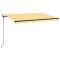 Auvent rétractable automatique 450x300 cm Jaune et blancCréez un endroit agréable et frais dans vos espaces extérieurs avec cet auvent rétractable ! Cet auvent d'extérieur est construit avec un cadre en aluminium enduit de poudre résistant à la rouille, ce qui le rend léger mais robuste. Le tissu de l'auvent de patio est en polyester haute densité avec revêtement en PU, résistant aux UV et à l'eau. De plus, l'angle et la hauteur peuvent être réglés selon vos préférences. Vous pouvez facilement ouvrir et rétracter le store rétractable automatique avec la télécommande incluse. De plus, la longue manivelle permet de contrôler le store en douceur. Les enfants doivent être surveillés pour s'assurer qu'ils ne jouent pas avec l'appareil.Tenez les enfants éloignés de la zone de montage. Attention : lisez attentivement les instructions avant l'utilisation et les conserver pour référence ultérieure.