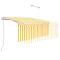 Auvent rétractable automatique avec store 3x2,5m Jaune et blancCréez un endroit agréable et frais dans vos espaces extérieurs avec cet auvent rétractable ! Cet auvent d'extérieur est construit avec un cadre en aluminium enduit de poudre résistant à la rouille, ce qui le rend léger mais robuste. Le tissu de l'auvent de patio est en polyester haute densité avec revêtement en PU, résistant aux UV et à l'eau. De plus, l'angle et la hauteur peuvent être réglés selon vos préférences. Vous pouvez facilement ouvrir et rétracter le store rétractable automatique avec la télécommande incluse. De plus, la longue manivelle permet de contrôler le store en douceur. Le store vous protège des rayons UV et offre une protection de l'intimité. Les enfants doivent être surveillés pour s'assurer qu'ils ne jouent pas avec l'appareil.Tenez les enfants éloignés de la zone de montage. Attention : lisez attentivement les instructions avant l'utilisation et les conserver pour référence ultérieure.