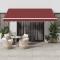 Auvent rétractable automatique bordeaux 400x350 cmCréez un endroit agréable et frais sur votre terrasse et protégez-vous des rayons UV avec cet auvent rétractable ! Matériau durable : le cadre de l'auvent est en aluminium enduit de poudre, ce qui est robuste et durable. Le tissu avec traitement de surface PU est résistant aux UV. Il protège votre famille ou vos invités des rayons UV et de la lumière éblouissante du soleil. Fonction automatique : vous pouvez facilement ouvrir et rétracter le store à l'aide de la télécommande fournie. Facile à utiliser : l'angle et la hauteur peuvent être réglés pour répondre à vos différents besoins. La manivelle permet d'ouvrir et de rétracter le store en douceur. Multifonctionnel : l'auvent rétractable présente un design simple et élégant qui s'intégrera parfaitement à votre maison ou dans un cadre commercial. Il convient à de nombreux endroits, tels que les balcons, les patios, les cours, les restaurants, les cafés, les magasins, etc. Les enfants doivent être surveillés pour s'assurer qu'ils ne jouent pas avec l'appareil.Tenez les enfants éloignés de la zone de montage. Attention : lisez attentivement les instructions avant l'utilisation et les conserver pour référence ultérieure.