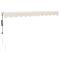 Auvent rétractable automatique crème 3,5x2,5 mProfitez d'une boisson fraîche, d'une délicieuse gâterie ou d'une conversation agréable avec des amis sur votre terrasse tout en vous détendant sous cet incroyable auvent rétractable automatique ! Matériau durable : le cadre de l'auvent est en aluminium enduit de poudre, ce qui est robuste et durable. Le tissu avec traitement de surface PU est résistant aux UV. Il protège votre famille ou vos invités des rayons UV et de la lumière éblouissante du soleil. Auvent rétractable : l'auvent de jardin est rétractable pour répondre à vos différents besoins. Il fournit de l' ombre rafraîchissante lorsque vous vous étirez et ne bloque pas la vue lorsqu' il est rétracté aussi. Fonctionnement facile : vous pouvez facilement ouvrir et rétracter l'auvent de jardin à l'aide de la télécommande fournie. La longue manivelle permet également de contrôler l'auvent extérieur en douceur lorsqu'il n'y a pas d'électricité. L'assemblage de cet auvent rétractable est facile. Conception murale : l'auvent de terrasse peut être facilement monté sur le mur à l'aide des supports muraux inclus et n'occupera pas d'espace au sol. Nombreuses applications : l'auvent électrique présente un design simple et élégant qui s'intégrera bien dans votre maison ou environnement commercial. Il convient à une variété d'endroits, tels que les balcons, les patios, les cours, les restaurants, les cafés, les magasins, et plus encore. Les enfants doivent être surveillés pour s'assurer qu'ils ne jouent pas avec l'appareil.Tenez les enfants éloignés de la zone de montage. Attention : lisez attentivement les instructions avant l'utilisation et les conserver pour référence ultérieure.