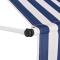 Auvent rétractable manuel 100 cm Rayures bleues et blanchesCet auvent rétractable sera idéal devant la fenêtre, sur la terrasse, le balcon ou dans votre jardin. Cet auvent hydrofuge et anti-salissure et résistant aux UV et aux intempéries est fabriqué en polyester de qualité avec un revêtement PU. Le cadre en acier fort rend l'auvent robuste et durable. L'auvent en polyester facile à nettoyer peut être retiré et lavé. Grâce à la manivelle de la poignée, ce store est rétractable. La hauteur et l'angle du store peuvent également être ajustés. C'est facile à assembler. Cet auvent est le choix idéal pour votre espace de vie extérieur et peut être actionné manuellement. Ne l'installez jamais dans des endroits élevés et venteux, car le parasol pourrait tomber et blesser des personnes. Le store doit être rétracté si la vitesse du vent est supérieure à 27 km/h.