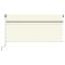 Auvent rétractable manuel avec store et LED 3,5x2,5 m CrèmeCréez un endroit agréable et frais dans vos espaces extérieurs avec cet auvent rétractable ! Cet auvent d'extérieur est construit avec un cadre en aluminium enduit de poudre résistant à la rouille, ce qui le rend léger mais robuste. Le tissu de l'auvent de patio est en polyester haute densité avec revêtement en PU, qui est résistant aux UV et à l'eau. De plus, l'angle et la hauteur peuvent être ajustés pour répondre à vos besoins spécifiques. Vous pouvez ouvrir et rétracter l'auvent en douceur avec la manivelle longue. De plus, les lampes à LED alimentées par l'énergie solaire assurent un éclairage nocturne économe en énergie. Le store vous protège des rayons UV et offre une protection de l'intimité. Danger ! Ressort fort lors de l'ouverture. Ne retirez pas cette corde si vous n'avez pas terminé toutes les étapes d'assemblage avec tous les boulons fixés et l'article fixé au mur ! Avertissement! Faire attention en desserrant les bras, car ils sont sous tension ! Un relâchement soudain du bras d'un auvent à bras articulés peut provoquer des blessures. Avertissement : Les instructions d'utilisation doivent être lues avant d'utiliser le produit. Avertissement: Le fonctionnement dans des conditions de gel peut endommager le produit. Utilisation externe dans les bâtiments et autres travaux de construction.Les enfants doivent être surveillés pour s'assurer qu'ils ne jouent pas avec l'appareil. Gardez les enfants éloignés de la zone d'assemblage. Avertissement : lisez attentivement les instructions avant d'utiliser l'appareil et conservez-les pour toute référence ultérieure. GPSR