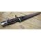 La baïonnette est complète avec son fourreau. Le fourreau est en bon état (petit trou visible sur la photo). La baïonnette se rengaine et se dégaine facilement, et est maintenue fermement dans son fourreau.