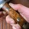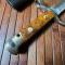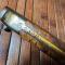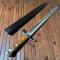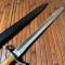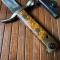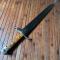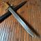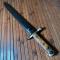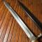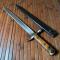 Plaquettes beau bois , bouton fonctionnel, lame entièrement dans son polie d'origine , marquage net . Dans son fourreau bronzé noir de guerre .