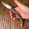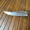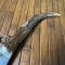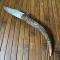 Manche en bois de Cerf , verrouillage de lame via resort à palme . Belle lame Yatagan bien tranchante,m sans piqûre , marquage dans un cartouche T.L&CO .