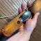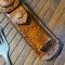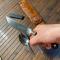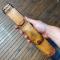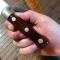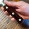 Couteau Sabatier extra fin France modèle déposé, lame 12 cm totale 23 cm , manche en bois de rose à trois rivets , très tranchant excellent état, couvert fourchette et cuillère, Pierre a aiguisé deux faces , le tout dans un très beau fourreau en cuir fin d'autruche, au logo Sabatier, passant ceinture et crochet pour ceinturon et passant de lacet de jambe ensemble rare en excellent état .