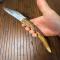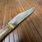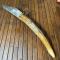 Manche en bois de Cerf, cran d'arrêt à palme , très bon état pour son âge , lame de 15 cm bien tranchante sans accident. Marquages LE BALKANIQUE MÉDAILLE D'OR BIEN NET.