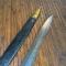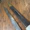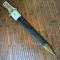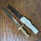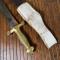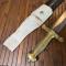 Dans son fourreau cuir ciré à deux garnitures laiton en partie décousu et son gousset en cuir blanchi.