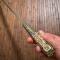 Manche bois habillé en fer et laiton ciselé pommeau à forme zoomorphe de tête de canidé (léger manque) Forte Lame de profil Yatagan à simple tranchant, pointe particulièrement effilé et fort contre tranchant , gravée de motifs géométriques et incrustée de pièces de laiton ciselé sur la quasi totalité de sa longueur ; dos de lame décorée en suite d'incrustation de laiton ciselé.